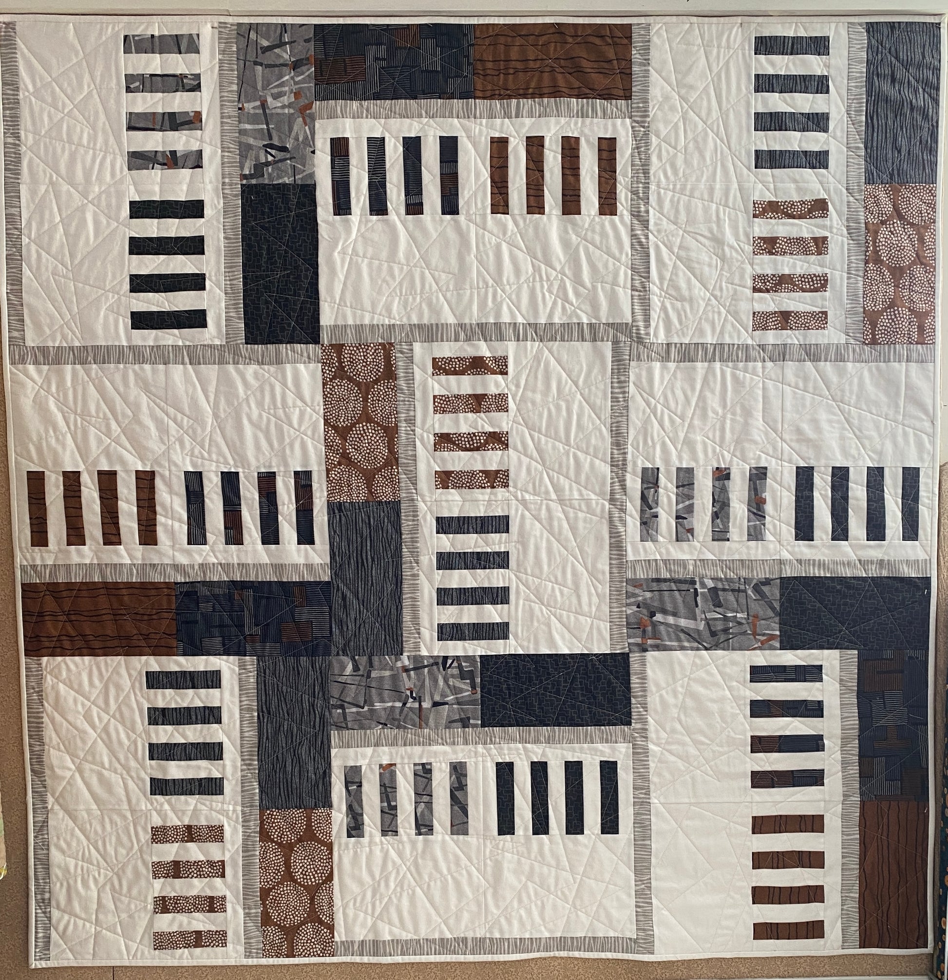 Use a Layer Cake (10" squares) or Fat Quarters and add sashing and background to make a woven composition with bars. Get a more shaded/tonal look with 2 background colors. This quick and easy quilt had instructions for Lap, Twin, Queen and King sizes.