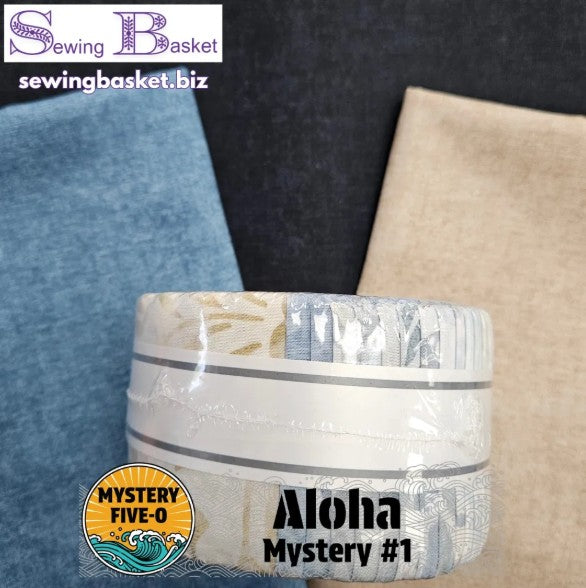 Aloha Mystery quilt fabric kit, Dk blue, Med blue, Lt brown, Morning Mist