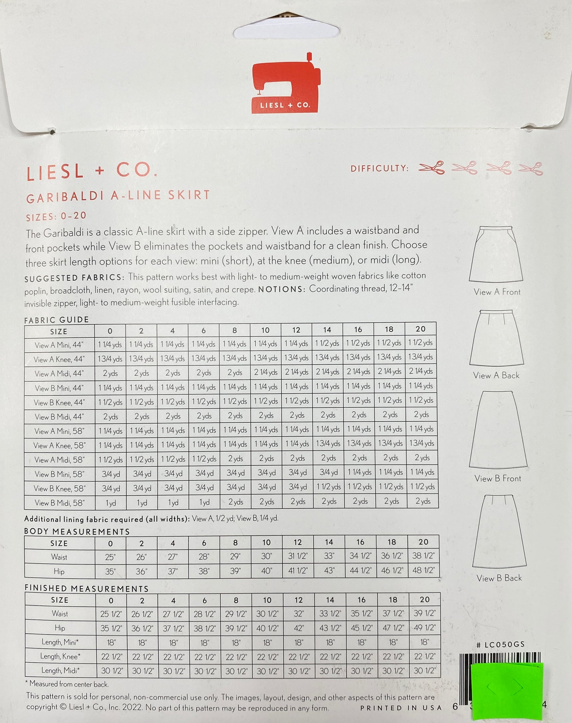 This is a really easy skirt pattern with great instructions. The Garibaldi is a classic A-line skirt with a side zipper. View A includes a waistband and front pockets while View B eliminates the pockets and waistband for a clean finish. Choose three skirt length options for each view: mini (short), at the knee (medium), or midi (long).