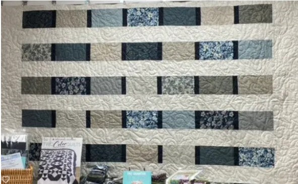Flower Show is the pattern in the Fat Quarter Love book (teal). The fabrics are assorted blues, gray, and taupe fabrics of Vintage Fleur for Robert Kaufman!